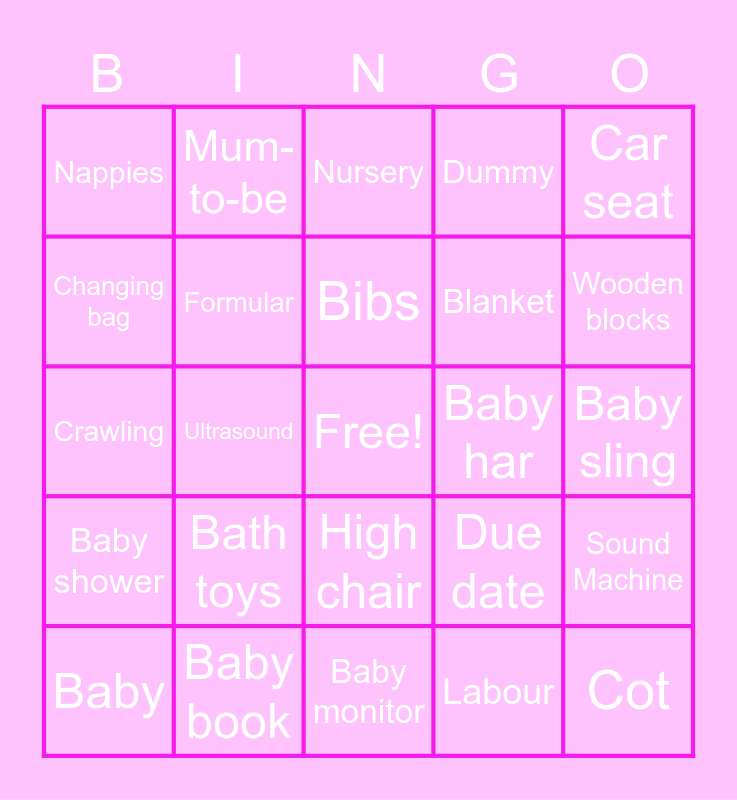 This bingo card has a free space and 31 words: Baby, Pram, Bibs, Baby Clothes, Car seat, Nappies, Formular, High chair, Blanket, Bottles, Baby shower, Ultrasound, Midwife, Labour, Sound Machine, Moses basket, Bath toys, Baby monitor, Baby har, Cot, Changing bag, Baby book, Bouncer, Dummy, Baby sling, Crawling, Mum-to-be, Nursery, Due date, Wooden blocks and Baby lotion.