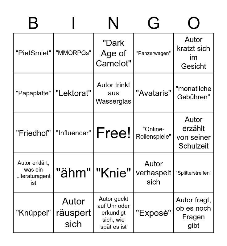 This bingo card has a free space and 24 words: "ähm", Autor räuspert sich, Autor trinkt aus Wasserglas, "Knüppel", Autor kratzt sich im Gesicht, "PietSmiet", "Papaplatte", "MMORPGs", "Online-Rollenspiele", "Knie", "Avataris", "Friedhof", Autor verhaspelt sich, "Splitterstreifen", "Lektorat", "Exposé", Autor erzählt von seiner Schulzeit, "Dark Age of Camelot", "monatliche Gebühren", "Influencer", Autor fragt, ob es noch Fragen gibt, Autor erklärt, was ein Literaturagent ist, "Panzerwagen" and Autor guckt auf Uhr oder erkundigt sich, wie spät es ist.