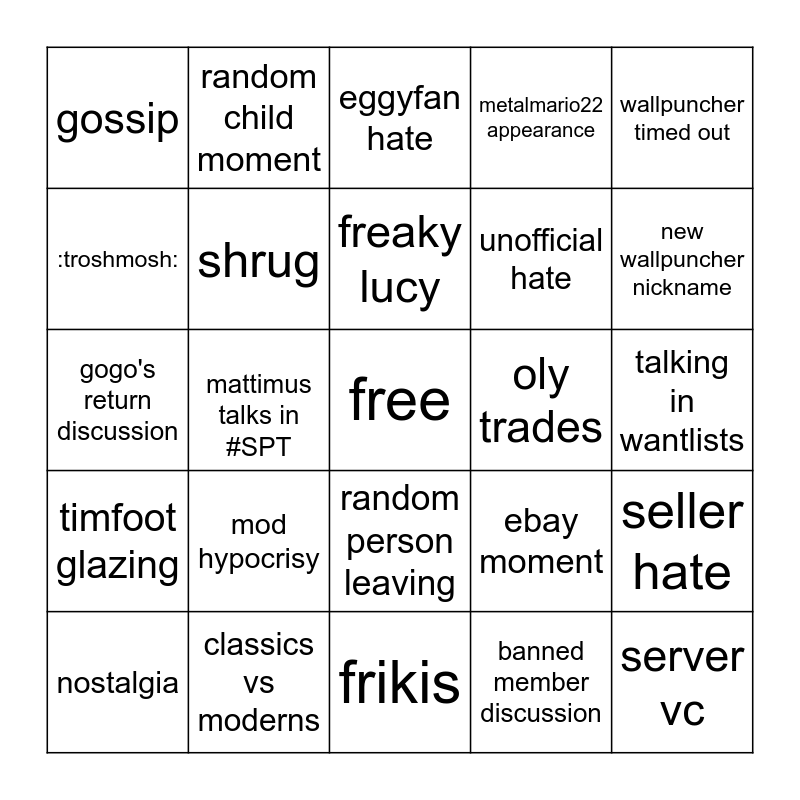 This bingo card has a free space and 24 words: mod hypocrisy, classics vs moderns, freaky lucy, nostalgia, wallpuncher timed out, gossip, :troshmosh:, random child moment, oly trades, random person leaving, unofficial hate, gogo's return discussion, ebay moment, seller hate, shrug, banned member discussion, talking in wantlists, eggyfan hate, new wallpuncher nickname, mattimus talks in #SPT, server vc, timfoot glazing, metalmario22 appearance and frikis.