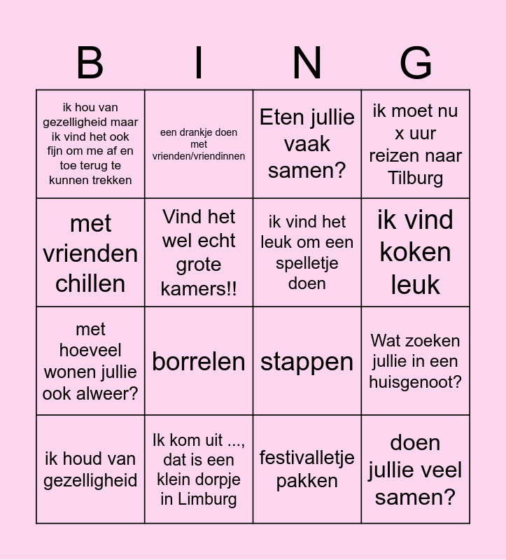 This bingo card has 16 words: Ik kom uit ..., dat is een klein dorpje in Limburg, Wat zoeken jullie in een huisgenoot?, Eten jullie vaak samen?, ik hou van gezelligheid maar ik vind het ook fijn om me af en toe terug te kunnen trekken, met hoeveel wonen jullie ook alweer?, een drankje doen met vrienden/vriendinnen, stappen, festivalletje pakken, met vrienden chillen, Vind het wel echt grote kamers!!, ik houd van gezelligheid, ik moet nu x uur reizen naar Tilburg, borrelen, ik vind koken leuk, ik vind het leuk om een spelletje doen and doen jullie veel samen?.