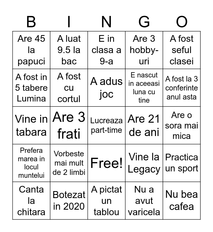 This bingo card has 26 words: Free!, Nu a avut varicela, A adus joc, Botezat in 2020, A fost seful clasei, Are 45 la papuci, A fost in 5 tabere Lumina, A luat 9.5 la bac, Are o sora mai mica, Vine la Legacy, E nascut in aceeasi luna cu tine, Vine in tabara, Practica un sport, Canta la chitara, Are 3 frati, Poate sa iti spuna un verset, Are 3 hobby-uri, Prefera marea in locul muntelui, E in clasa a 9-a, Lucreaza part-time, A fost la 3 conferinte anul asta, A pictat un tablou, Are 21 de ani, Vorbeste mai mult de 2 limbi, A fost cu cortul and Nu bea cafea.