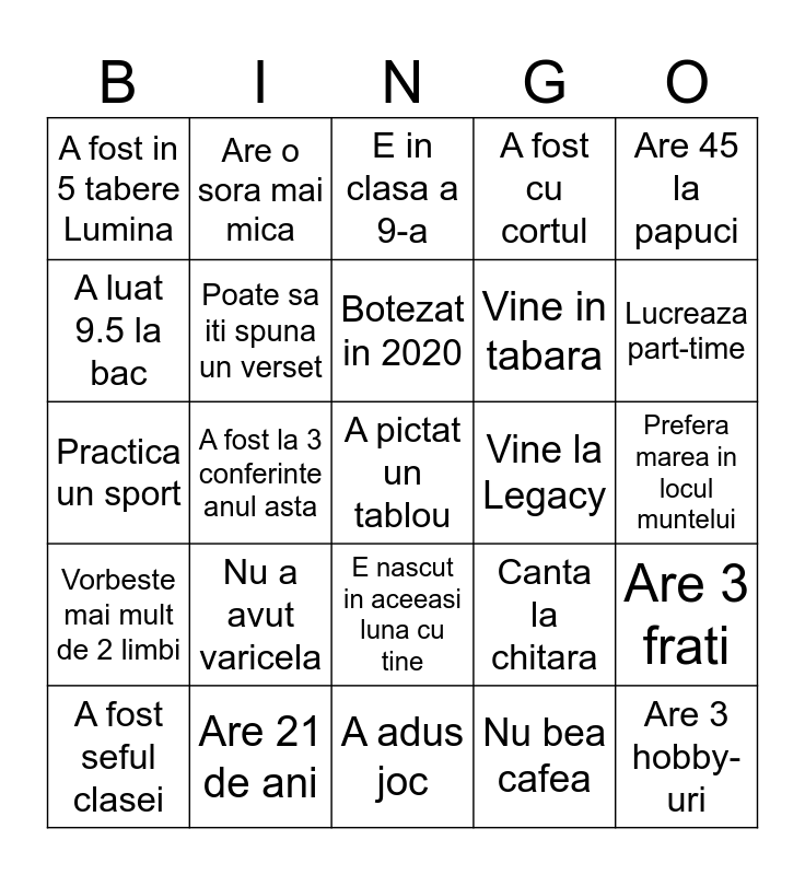 This bingo card has 25 words: Nu a avut varicela, A adus joc, Botezat in 2020, A fost seful clasei, Are 45 la papuci, A fost in 5 tabere Lumina, A luat 9.5 la bac, Are o sora mai mica, Vine la Legacy, E nascut in aceeasi luna cu tine, Vine in tabara, Practica un sport, Canta la chitara, Are 3 frati, Poate sa iti spuna un verset, Are 3 hobby-uri, Prefera marea in locul muntelui, E in clasa a 9-a, Lucreaza part-time, A fost la 3 conferinte anul asta, A pictat un tablou, Are 21 de ani, Vorbeste mai mult de 2 limbi, A fost cu cortul and Nu bea cafea.