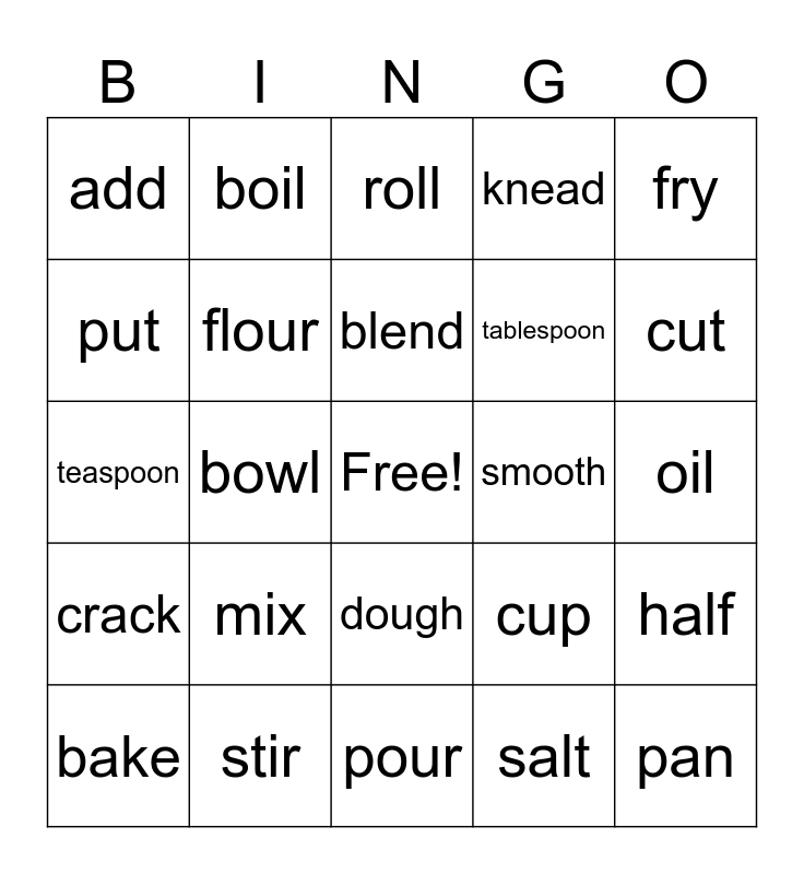 This bingo card has a free space and 24 words: mix, stir, blend, bake, fry, add, put, boil, smooth, dough, tablespoon, teaspoon, cup, half, flour, salt, oil, roll, cut, bowl, pan, crack, knead and pour.