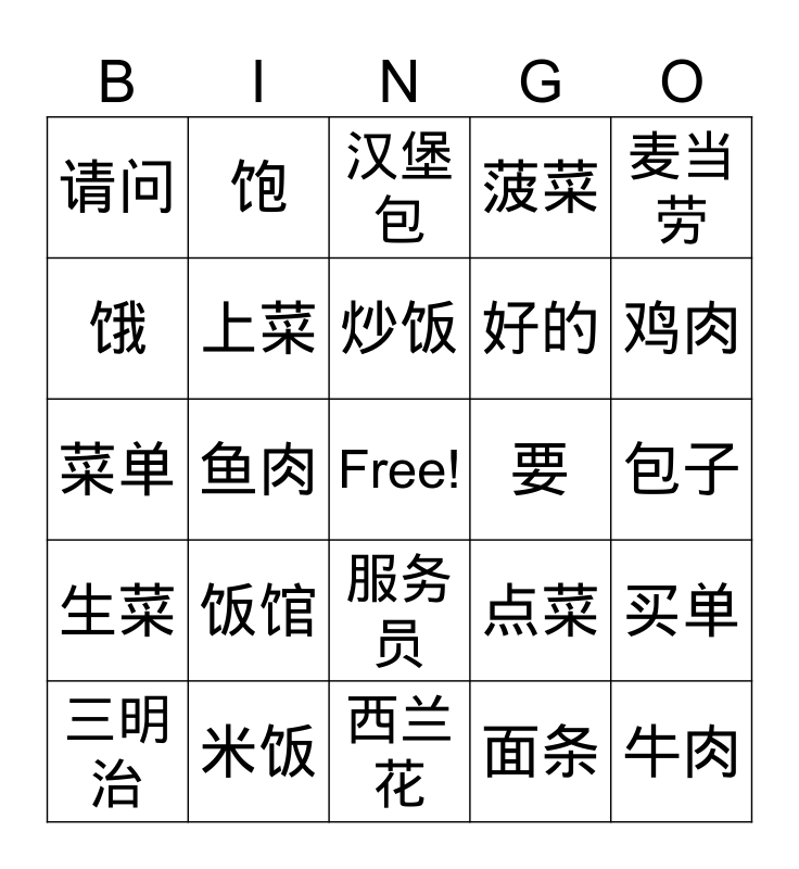 Food Bingo | Lesson 6 | Lesson D: Chinese Food | 在饭馆-Lexique | 食物