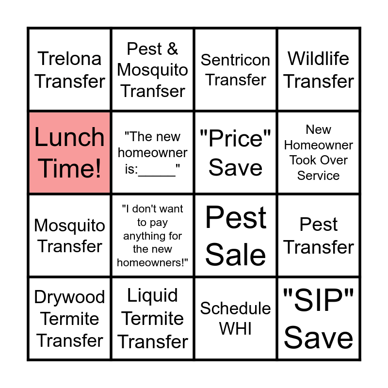 This bingo card has 16 words: Liquid Termite Transfer, Pest Transfer, Sentricon Transfer, Trelona Transfer, Mosquito Transfer, Pest & Mosquito Tranfser, Pest Sale, Schedule WHI, Lunch Time!, "The new homeowner is:_____", Drywood Termite Transfer, Wildlife Transfer, "I don't want to pay anything for the new homeowners!", New Homeowner Took Over Service, "Price" Save and "SIP" Save.