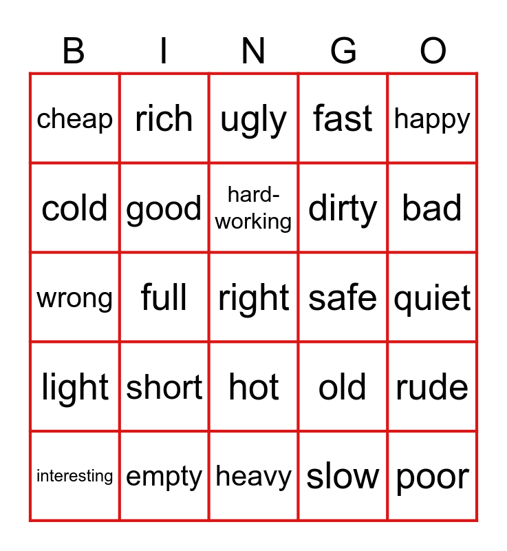 This bingo card has a free space and 39 words: clean, big, young, good, interesting, hot, hard-working, early, happy, light, full, fast, poor, quiet, safe, short, beautiful, cheap, polite, old, cold, heavy, dirty, bad, small, boring, lazy, late, sad, rich, long, noisy, ugly, empty, slow, expensive, rude, wrong and dangerous.