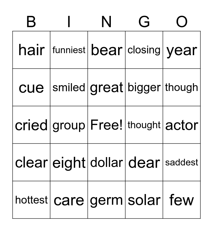 This bingo card has a free space and 36 words: sitting, shopping, clapped, bigger, saddest, hottest, smiled, safest, closing, babies, cried, funniest, dollar, solar, actor, hair, care, bear, dear, year, clear, eight, great, straight, few, cue, group, bought, thought, though, city, circle, germ, chef, school and ghost.
