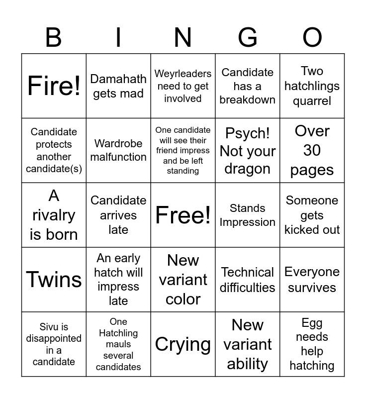 This bingo card has a free space and 24 words: An early hatch will impress late, One Hatchling mauls several candidates, One candidate will see their friend impress and be left standing, Sivu is disappointed in a candidate, Two hatchlings quarrel, Fire!, Candidate protects another candidate(s), Damahath gets mad, Stands Impression, New variant color, Psych! Not your dragon, A rivalry is born, Technical difficulties, Everyone survives, Wardrobe malfunction, New variant ability, Someone gets kicked out, Weyrleaders need to get involved, Over 30 pages, Candidate arrives late, Egg needs help hatching, Twins, Candidate has a breakdown and Crying.