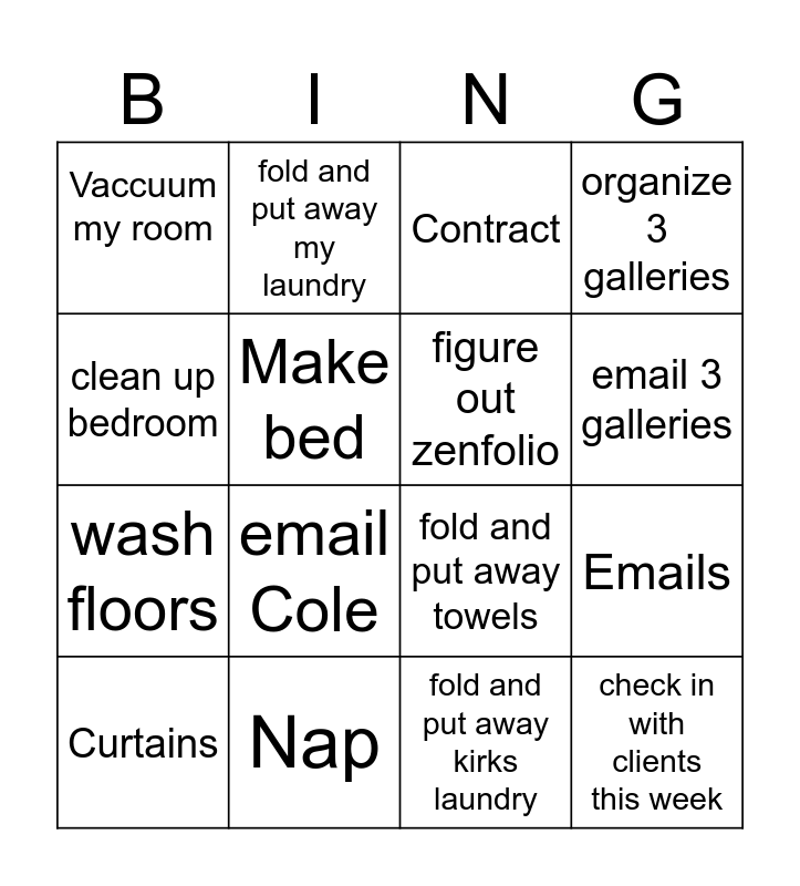 This bingo card has 16 words: Nap, Emails, Contract, Vaccuum my room, wash floors, fold and put away my laundry, fold and put away towels, fold and put away kirks laundry, clean up bedroom, Make bed, Curtains, organize 3 galleries, email Cole, email 3 galleries, figure out zenfolio and check in with clients this week.
