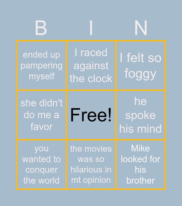 This bingo card has a free space and 8 words: he spoke his mind, I felt so foggy, I raced against the clock, you wanted to conquer the world, ended up pampering myself, Mike looked for his brother, she didn't do me a favor and the movies was so hilarious in mt opinion.