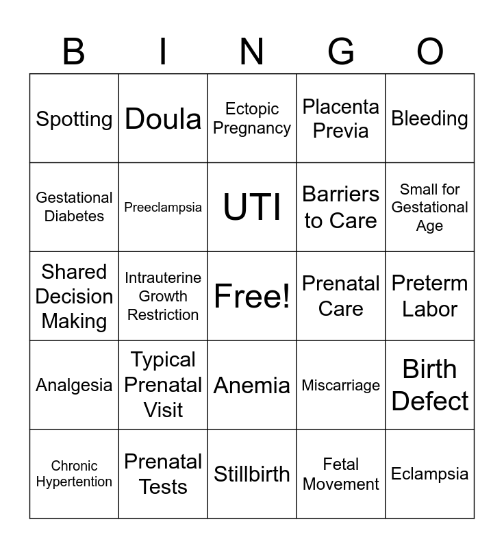 This bingo card has a free space and 24 words: Typical Prenatal Visit, Prenatal Tests, UTI, Chronic Hypertention, Bleeding, Spotting, Gestational Diabetes, Doula, Prenatal Care, Anemia, Barriers to Care, Shared Decision Making, Miscarriage, Birth Defect, Preeclampsia, Fetal Movement, Preterm Labor, Ectopic Pregnancy, Small for Gestational Age, Intrauterine Growth Restriction, Eclampsia, Analgesia, Placenta Previa and Stillbirth.
