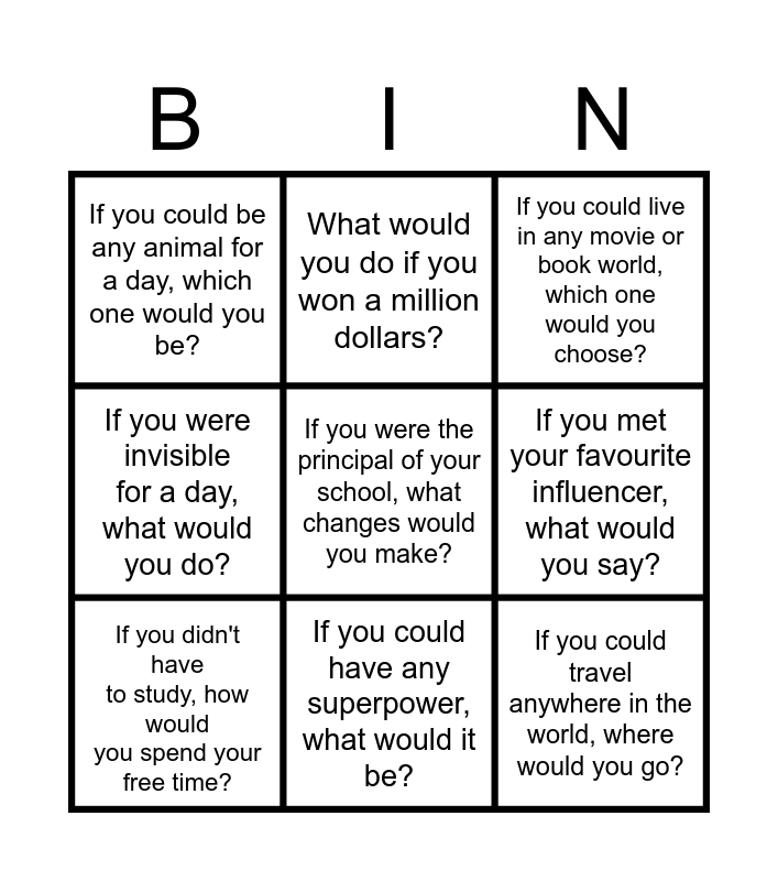 This bingo card has 9 words: If you didn't have to study, how would you spend your free time?, If you could live in any movie or book world, which one would you choose?, What would you do if you won a million dollars?, If you were invisible for a day, what would you do?, If you could be any animal for a day, which one would you be?, If you met your favourite influencer, what would you say?, If you were the principal of your school, what changes would you make?, If you could travel anywhere in the world, where would you go? and If you could have any superpower, what would it be?.