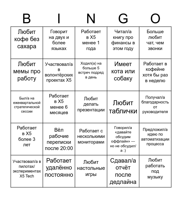 This bingo card has 25 words: Работает в X5 более 3 лет, Работает удалённо постоянно, Любит делать презентации, Сдавал/а отчёт после дедлайна, Больше любит чат, чем звонки, Любит кофе без сахара, Говорит на двух и более языках, Работает в X5 менее 1 года, Любит таблички, Предложил/а идею по автоматизации процесса, Любит мемы про работу, Участвовал/а в волонтёрских проектах X5, Любит настольные игры, Говорил/а «давайте обсудим оффлайн» — но не обсудил/а :), Работает в кофейне хотя бы раз в неделю, Участвовал/а в пилотах/экспериментах X5 Tech, Работает в X5 менее 6 месяцев, Ходил(а) на больше 5 встреч подряд в день, Имеет кота или собаку, Получал/а благодарность от руководителя, Был/а на ежеквартальной стратегической сессии, Вёл рабочие переписки после 20:00, Работает с несколькими мониторами, Читал/а книгу про финансы в этом году and Любит работать под музыку.