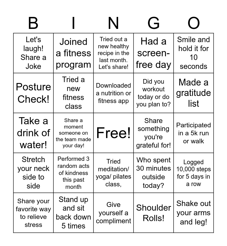 This bingo card has a free space and 29 words: Share your favorite way to relieve stress, Brain teaser!, Share a moment someone on the team made your day!, Repeat an affirmation: “I am calm and capable”, Let's laugh! Share a Joke, Tried out a new healthy recipe in the last month. Let's share!, Tried a new fitness class, Performed 3 random acts of kindness this past month, Share something you're grateful for!, Stand up and sit back down 5 times, Participated in a 5k run or walk, Shake out your arms and leg!, Give yourself a compliment, Shoulder Rolls!, Made a gratitude list, Takes a 1-hour technology break daily., Tried meditation/ yoga/ pilates class,, Stretch your neck side to side, Smile and hold it for 10 seconds, Take a drink of water!, Who spent 30 minutes outside today?, Wrote down 1 positive affirmation., Did you workout today or do you plan to?, Posture Check!, Had a screen-free day, Joined a fitness program, Logged 10,000 steps for 5 days in a row, Downloaded a nutrition or fitness app and Went to a yearly check up with PCP.