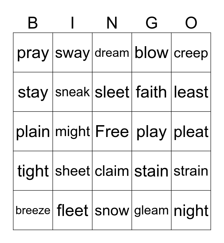 This bingo card has a free space and 24 words: sheet, fleet, sleet, breeze, creep, pray, stay, sway, play, claim, faith, plain, stain, strain, sneak, gleam, pleat, dream, least, might, night, tight, blow and snow.