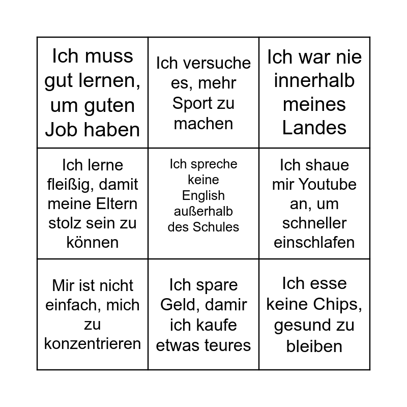 This bingo card has a free space and 8 words: Ich shaue mir Youtube an, um schneller einschlafen, Ich war nie innerhalb meines Landes, Ich versuche es, mehr Sport zu machen, Mir ist nicht einfach, mich zu konzentrieren, Ich muss gut lernen, um guten Job haben, Ich esse keine Chips, gesund zu bleiben, Ich lerne fleißig, damit meine Eltern stolz sein zu können and Ich spare Geld, damir ich kaufe etwas teures.