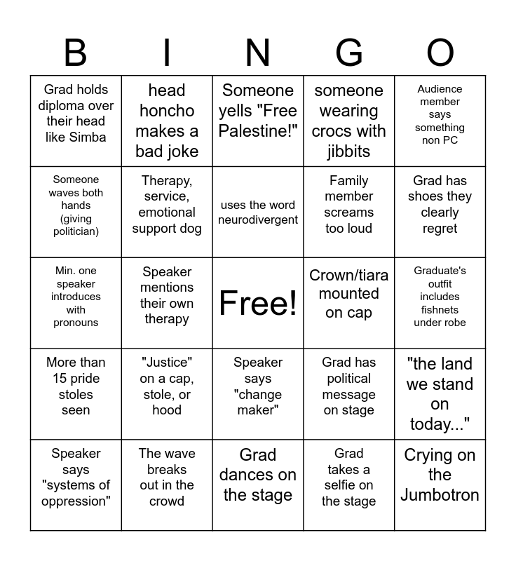 This bingo card has a free space and 29 words: Speaker says "systems of oppression", Hot pink hair under cap, Speaker mentions their own therapy, Grad trips on stage, Grad holds diploma over their head like Simba, Someone yells "Free Palestine!", Therapy, service, emotional support dog, "Justice" on a cap, stole, or hood, Crown/tiara mounted on cap, The wave breaks out in the crowd, Graduate's outfit includes fishnets under robe, Crying on the Jumbotron, Grad dances on the stage, Grad takes a selfie on the stage, Grad has shoes they clearly regret, Faculty on phone, Speaker says "change maker", More than 15 pride stoles seen, Audience member says something non PC, Min. one speaker introduces with pronouns, Grad has political message on stage, Speaker says "Trump" directly, Family member screams too loud, Someone waves both hands (giving politician), someone wearing crocs with jibbits, head honcho makes a bad joke, "the land we stand on today...", uses the word neurodivergent and speaker gets too personal "trauma".