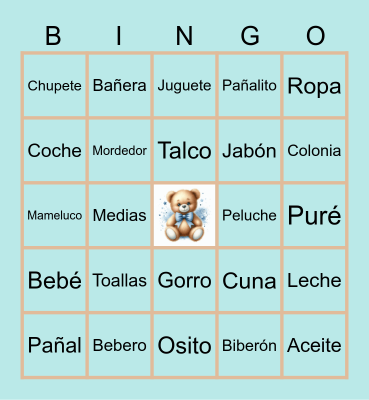 This bingo card has a free space and 24 words: Pañal, Toallas, Talco, Biberón, Ropa, Chupete, Bañera, Juguete, Peluche, Puré, Mameluco, Mordedor, Cuna, Leche, Coche, Bebero, Osito, Pañalito, Colonia, Bebé, Medias, Gorro, Jabón and Aceite.