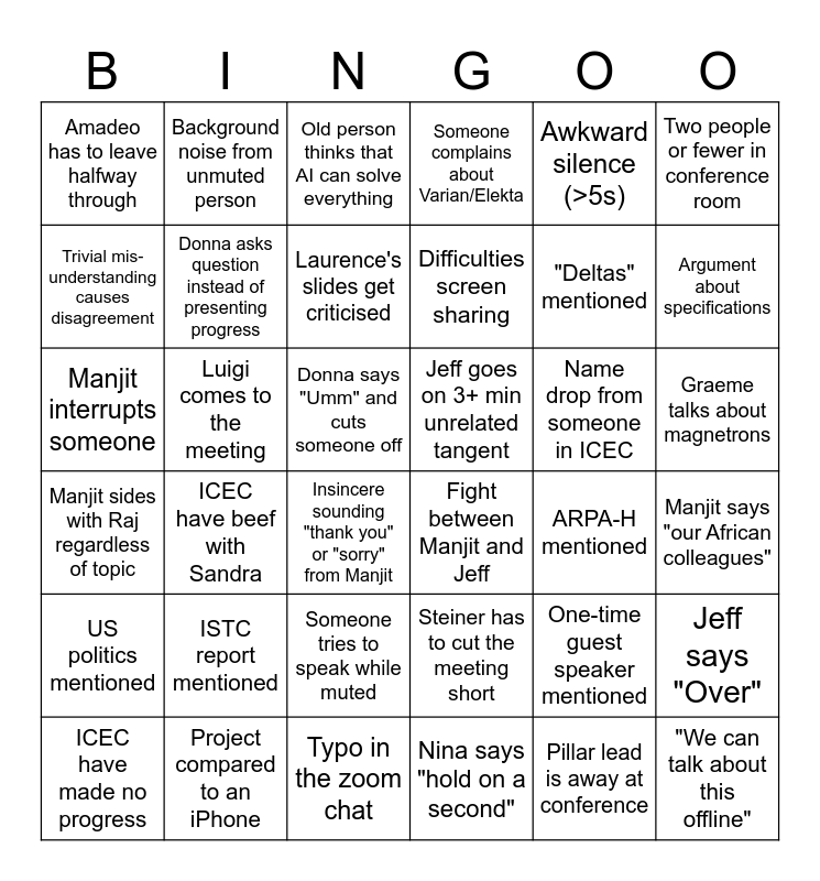 This bingo card has 36 words: Steiner has to cut the meeting short, Someone tries to speak while muted, Nina says "hold on a second", Trivial mis-understanding causes disagreement, Manjit sides with Raj regardless of topic, Jeff goes on 3+ min unrelated tangent, Donna asks question instead of presenting progress, Typo in the zoom chat, Awkward silence (>5s), One-time guest speaker mentioned, Argument about specifications, Someone complains about Varian/Elekta, Jeff says "Over", Luigi comes to the meeting, Difficulties screen sharing, Amadeo has to leave halfway through, US politics mentioned, Name drop from someone in ICEC, Manjit interrupts someone, Old person thinks that AI can solve everything, Donna says "Umm" and cuts someone off, ICEC have beef with Sandra, Fight between Manjit and Jeff, Insincere sounding "thank you" or "sorry" from Manjit, ARPA-H mentioned, Background noise from unmuted person, "Deltas" mentioned, Project compared to an iPhone, Laurence's slides get criticised, Two people or fewer in conference room, "We can talk about this offline", ICEC have made no progress, Manjit says "our African colleagues", Graeme talks about magnetrons, ISTC report mentioned and Pillar lead is away at conference.