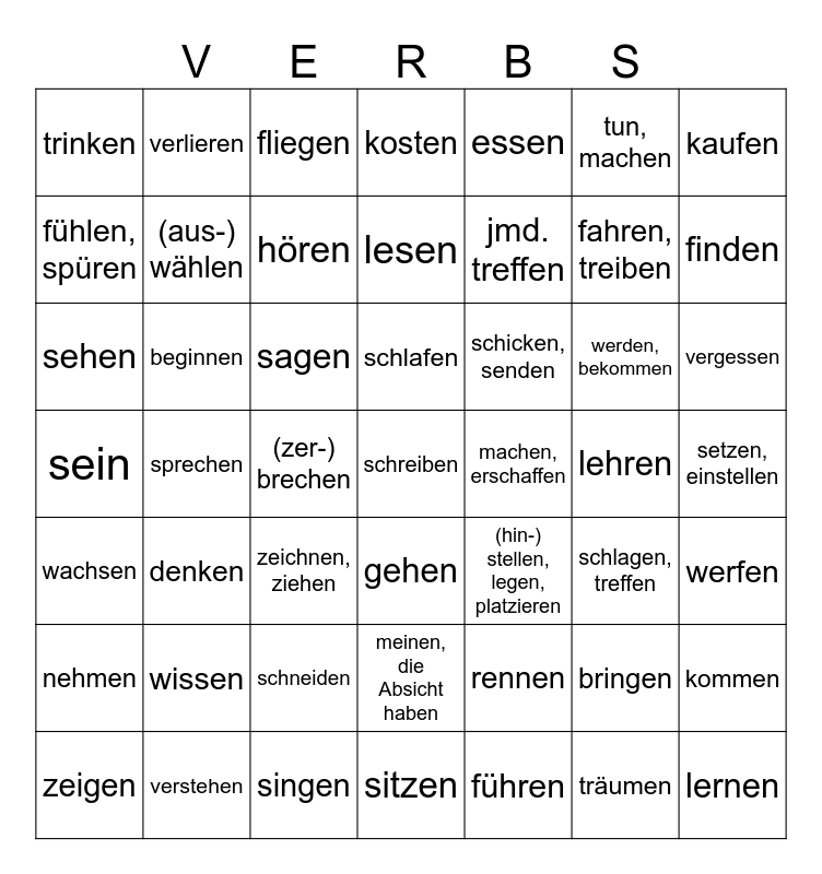 This bingo card has 61 words: Free!, sein, werden, beginnen, (zer-) brechen, bringen, kaufen, fangen, (aus-) wählen, kommen, kosten, schneiden, tun, machen, zeichnen, ziehen, träumen, trinken, fahren, treiben, essen, fallen, fühlen, spüren, finden, fliegen, vergessen, werden, bekommen, geben, gehen, wachsen, haben, hören, schlagen, treffen, behalten, (etw.) weitermachen, wissen, führen, lernen, verlieren, machen, erschaffen, meinen, die Absicht haben, jmd. treffen, (hin-) stellen, legen, platzieren, lesen, rennen, sagen, sehen, verkaufen, schicken, senden, setzen, einstellen, zeigen, singen, sitzen, schlafen, sprechen, stehen, nehmen, lehren, sagen, erzählen, denken, werfen, verstehen, gewinnen, schreiben and können.