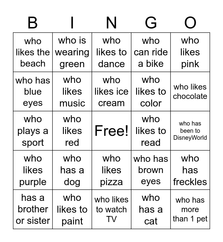 This bingo card has a free space and 29 words: has a brother or sister, who likes blue, who likes red, who likes to swim, who likes the beach, who likes to dance, who likes music, who has a dog, who likes to read, who likes to paint, who has been to DisneyWorld, who has more than 1 pet, who likes to watch TV, who has a cat, who likes chocolate, who likes school, who likes pizza, who likes purple, who likes pink, who plays a sport, who has brown eyes, who has been on an airplane, who likes to color, who has blue eyes, who can ride a bike, who is wearing green, who has freckles, who likes ice cream and who can whistle.