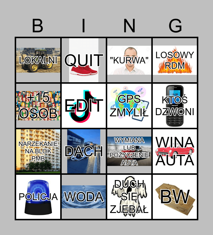 This bingo card has 16 images and 16 words: WODA, WINA AUTA, "KURWA", LOKALNI, NARZEKANIE NA BLOK PMB, QUIT, WYMIANA LUB POŻYCZENIE AUTA, DUCH SIĘ ZJEBAŁ, +15 OSOB, EDIT, POLICJA, LOSOWY RDM, DACH, KTOŚ DZWONI, GPS ZMYLIŁ and BW.