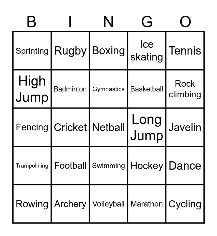 This bingo card has a free space and 24 words: Football, Archery, Gymnastics, Rowing, Tennis, Sprinting, High Jump, Rugby, Long Jump, Swimming, Basketball, Fencing, Hockey, Dance, Badminton, Marathon, Javelin, Boxing, Rock climbing, Cricket, Cycling, Trampolining, Ice skating and Volleyball.