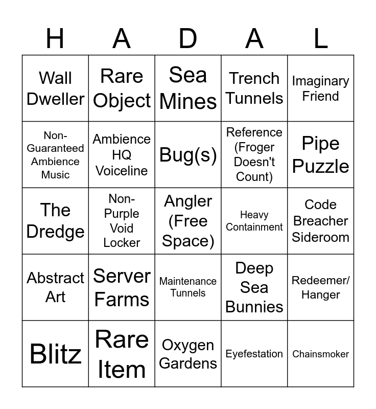 This bingo card has a free space and 44 words: Pinkie, Chainsmoker, Froger, Blitz, Pandemonium, Eyefestation, Sea Mines, Rare Room, Imaginary Friend, Rare Item, Trench Tunnels, Heavy Containment, Maintenance Tunnels, Server Farms, Flooded Rooms, Oxygen Gardens, River Rooms, The Dredge, Vents, Pipe Puzzle, Rare Object, Gauntlet, Rotten Coral, Wall Dweller, Triple Good People Room, Code Breacher Sideroom, Airlocks, Turret Room, Deep Sea Bunnies, Abstract Art, Non-Guaranteed Document Room, Redeemer/ Hanger, Candlebearer, Candlebrute, Non-Purple Void Locker, Rare Monster/ Entity, Trip Wire, Land Mine, Bug(s), Non-Guaranteed Ambience Music, Reference (Froger Doesn't Count), Purple Keycard Room, Ambience HQ Voiceline and Electrified Water.