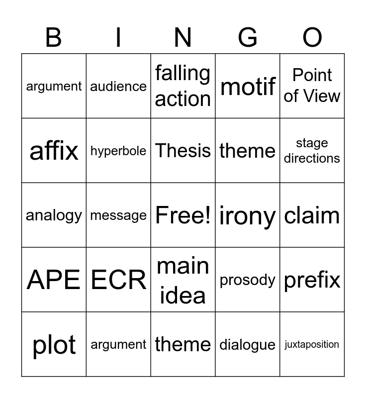 This bingo card has a free space and 59 words: tone, argument, key idea, APE, dialogue, rising action, hyperbole, stanza, theme, analogy, motif, characterization, affix, suffix, personification, argument, juxtaposition, Point of View, figurative language, Thesis, irony, falling action, plot, prefix, conflict, satire, semicolon, clixmax, stage directions, authors purpose, text evidence, symbolism, soliloquy, setting, audience, structure, root word, message, unresolved, analogy, SCR, ECR, claim, cite sources, intended audience, scientific evidence, quotation, article, main idea, theme, narrator, organizational patter, introduction, unresolved, flashback, prosody, Edgar Allen Poe, 64 days and $8,000 and Real Experience.