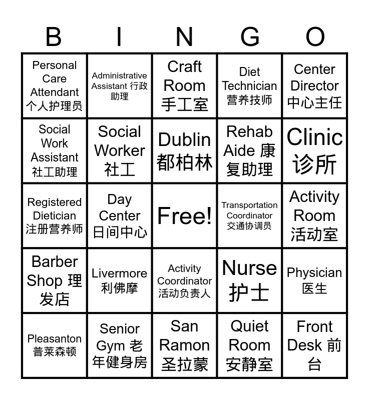 This bingo card has a free space and 25 words: Livermore 利佛摩, San Ramon 圣拉蒙, Dublin 都柏林, Pleasanton 普莱森顿, Center Director 中心主任, Personal Care Attendant 个人护理员, Social Work Assistant 社工助理, Administrative Assistant 行政助理, Transportation Coordinator 交通协调员, Activity Coordinator 活动负责人, Rehab Aide 康复助理, Registered Dietician 注册营养师, Nurse 护士, Physician 医生, Social Worker 社工, Occupational Therapist 职业治疗师, Activity Room 活动室, Craft Room 手工室, Clinic 诊所, Day Center 日间中心, Front Desk 前台, Senior Gym 老年健身房, Barber Shop 理发店, Diet Technician 营养技师 and Quiet Room 安静室.