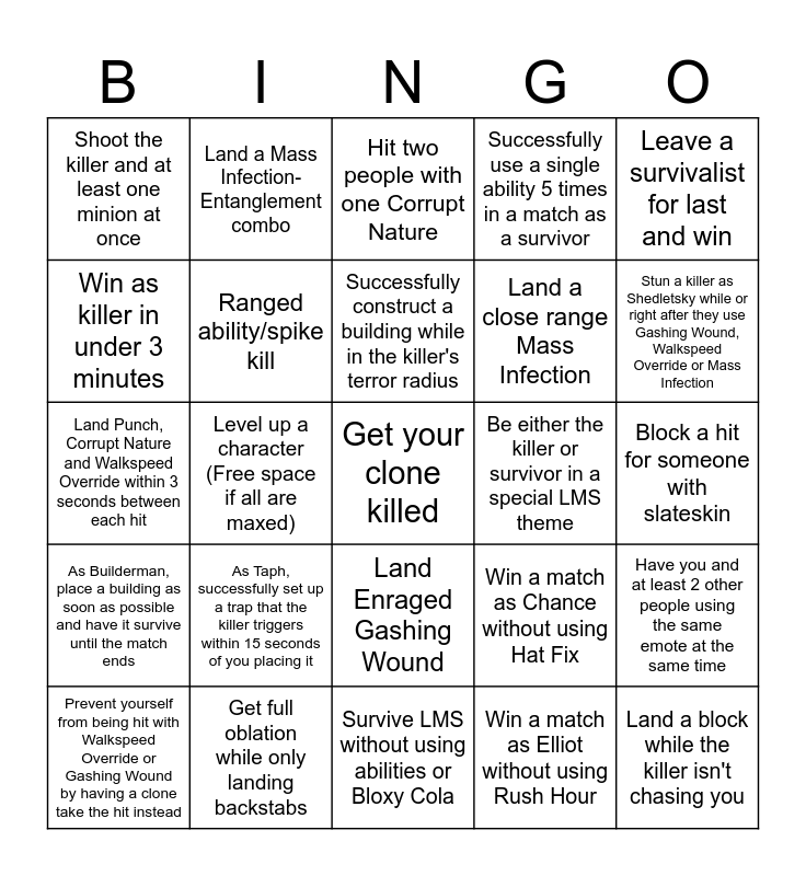 This bingo card has 30 words: Get full oblation while only landing backstabs, Never hear the chase layer/layer 4 for the entire match, Level up a character (Free space if all are maxed), Hit both the killer and a survivor with a single Plasma Beam, Shoot the killer and at least one minion at once, Hit two people with one Corrupt Nature, Ranged ability/spike kill, Land Enraged Gashing Wound, Be either the killer or survivor in a special LMS theme, Survive LMS without using abilities or Bloxy Cola, Block a hit for someone with slateskin, Get your clone killed, Win a match as Elliot without using Rush Hour, Land a block while the killer isn't chasing you, Stun a killer as Shedletsky while or right after they use Gashing Wound, Walkspeed Override or Mass Infection, Kill a survivor with a skin while using a killer skin from the same source material (ex. Kill Dr. Ludwig as Butcher), Win a match as Chance without using Hat Fix, As Builderman, place a building as soon as possible and have it survive until the match ends, As Taph, successfully set up a trap that the killer triggers within 15 seconds of you placing it, Leave a survivalist for last and win, Land Punch, Corrupt Nature and Walkspeed Override within 3 seconds between each hit, Win a match as John Doe without using Digital Footprint, Land a Mass Infection-Entanglement combo, Land a close range Mass Infection, Win as killer in under 3 minutes, Successfully use a single ability 5 times in a match as a survivor, Have you and at least 2 other people using the same emote at the same time, Prevent yourself from being hit with Walkspeed Override or Gashing Wound by having a clone take the hit instead, Successfully construct a building while in the killer's terror radius and Have a minion kill a survivor.