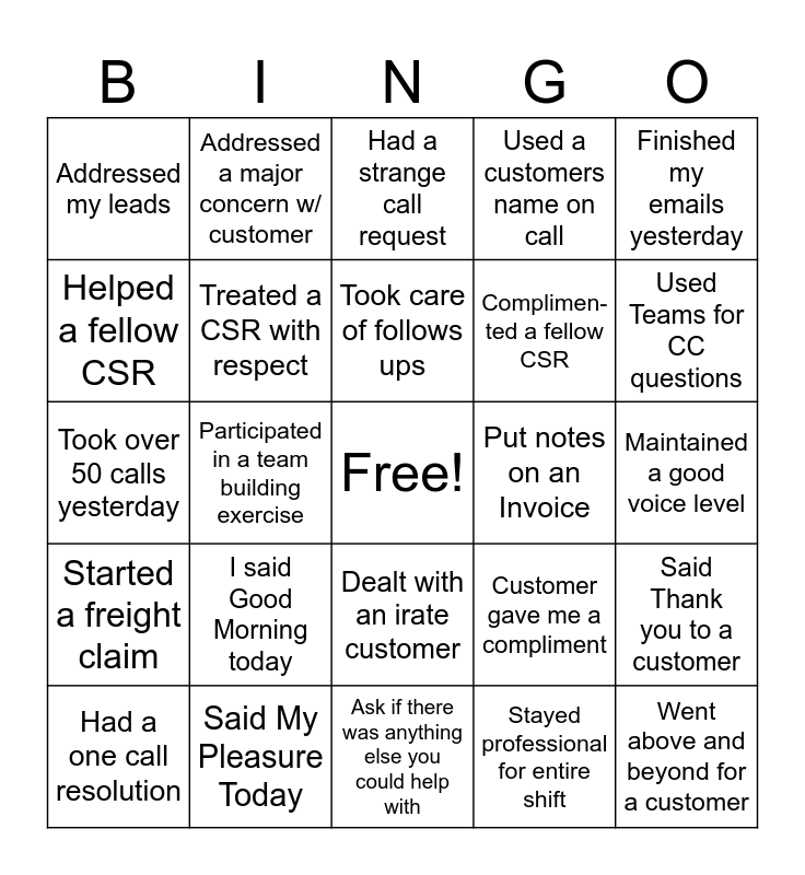 This bingo card has a free space and 24 words: I said Good Morning today, Said My Pleasure Today, Took care of follows ups, Had a one call resolution, Finished my emails yesterday, Addressed my leads, Helped a fellow CSR, Addressed a major concern w/ customer, Put notes on an Invoice, Dealt with an irate customer, Complimen-ted a fellow CSR, Took over 50 calls yesterday, Customer gave me a compliment, Said Thank you to a customer, Treated a CSR with respect, Stayed professional for entire shift, Maintained a good voice level, Had a strange call request, Used Teams for CC questions, Participated in a team building exercise, Went above and beyond for a customer, Started a freight claim, Used a customers name on call and Ask if there was anything else you could help with.