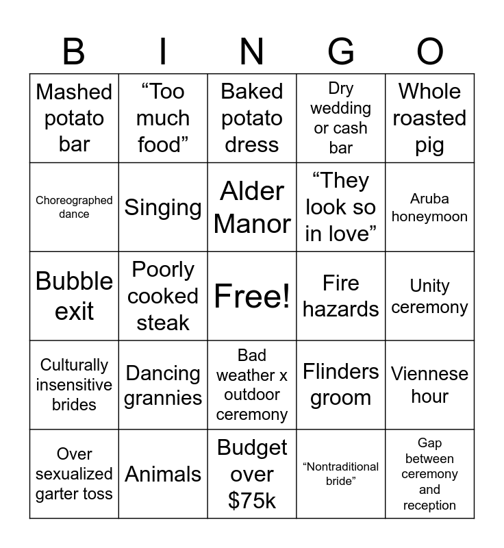 This bingo card has a free space and 24 words: Dancing grannies, Animals, Alder Manor, Over sexualized garter toss, Whole roasted pig, Mashed potato bar, Choreographed dance, “Too much food”, Fire hazards, Bad weather x outdoor ceremony, “They look so in love”, Bubble exit, Flinders groom, Viennese hour, Singing, “Nontraditional bride”, Unity ceremony, Baked potato dress, Aruba honeymoon, Poorly cooked steak, Gap between ceremony and reception, Culturally insensitive brides, Dry wedding or cash bar and Budget over $75k.