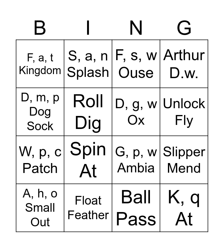 This bingo card has 104 words: Free!, Taps In Tin, D, m, p Dog Sock, A, l, r Big, B, f, u P, Horse Jump, Q, g, r Ook, Fox Party, Wizard Cave, Fuzz Vowels, Moon Ain, D, s, f Wordgirl, Thing Splash, C, h Chicken, Diphthong Digraph, Dinosaur Tree, F, s, w Ouse, Roy Esme, Light Kick, G, s, t Og, B, d, r Tree, Pocoyo Pop, Pole Key, A, l, s Log, G, h, i Door, R, s, d Ake, Spin At, Arthur D.w., L, r, d Ell, F, n Sticks, More Fast, D, o, r Jump, Box At, K, c, t Jump, Pumpkin Children, House Ox, G, p, v Balloon, B, y, t Fair, Unlock Fly, W, g, h Open, U, m, p Sky, K, q At, A, f, t Vine, Roll Dig, Down Eed, F, a, t Kingdom, E, l, s Ing, A, h, o Small Out, Straw Icks, B, f, h Carrot, N, y, e Elinor, Nature Og, G, h, l Jet, Bo Pull, Fly Dance, D, b, x Clean, Gbsd Cheese, Friend Y, A, g, l Ain, C, a, f Mix, Ball Pass, Drop Lift, W, o, e Mia, D, g, v Ail, Xavier Presidents, Go Clock, Nice Prairie, S, a, n Splash, G, p, w Ambia, Slipper Mend, C, b, s Meatball, F, p, z Ish, Saddle Spin, A, c, z Ant, Harp Horse, Kid Ouse, Car Ouse, C, f, o Ow, B, r, g Dots, Peanut Sun, M, j, n Moogoopi, Stop Web Blow, D, g, w Ox, Banana Ail, Float Feather, Ramp Pig, en, Looloo, Rev Roll, Ox At, None, Moon Og, Clifford At, Jump Fetch, W, o, s Ain, R, c, f Animal, Pinkalicious Fix, L, w, h Ouse, W, p, c Patch, Jet Slide, D, f, c Clubhouse, G, m, u House, E, p, w Ambia, House Chrysalis and Fizzy Zipline.