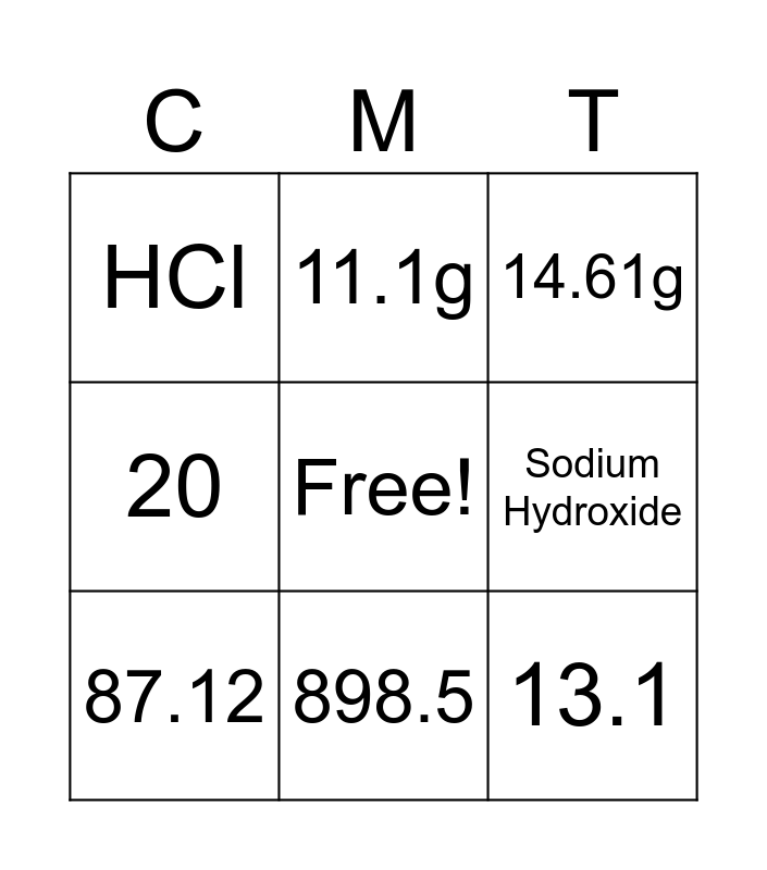 This bingo card has a free space and 8 words: Sodium Hydroxide, 14.61g, 11.1g, 87.12, HCl, 13.1, 20 and 898.5.