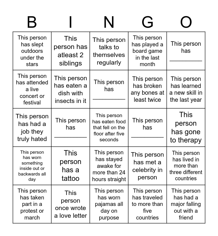 This bingo card has 46 words: This person has been scuba diving, This person has eaten food that fell on the floor after five seconds, This person has taken a selfie with a wild animal, This person has worn pajamas all day on purpose, This person has a tattoo, This person has tried to open a can without a can opener, This person has atleast 2 siblings, This person has appeared on TV or in a newspaper, This person has attended a live concert or festival, This person has run a marathon, This person has eaten a dish with insects in it, This person has played a board game in the last month, This person has lived in more than three different countries, This person has met a celebrity in person, This person has volunteered, This person has a phobia of something unusual, This person has __________, This person has __________, This person has __________, This person has __________, This person has __________, This person has traveled to more than five countries, This person has slept outdoors under the stars, This person has broken any bones at least twice, This person has binge-watched an entire TV series in one weekend, This person has learned a new skill in the last year, This person has taken part in a protest or march, This person has a diary or journal, This person has stayed awake for more than 24 hours straight, This person has worn something inside out or backwards all day, This person has had atleast a 3-year-long relationship, This person has lost a pet they loved deeply, This person speaks more than three languages, This person has cried in public recently, This person has ghosted someone (or been ghosted), This person once wrote a love letter, This person has gone to therapy, This person has been to a funeral this year, This person has moved to a new city for love, This person has been in a long-distance relationship, This person has had a major falling out with a friend, This person talks to themselves regularly, This person has had a job they truly hated, This person has felt homesick recently, This person has cried watching a movie and This person has reconnected with someone after years.