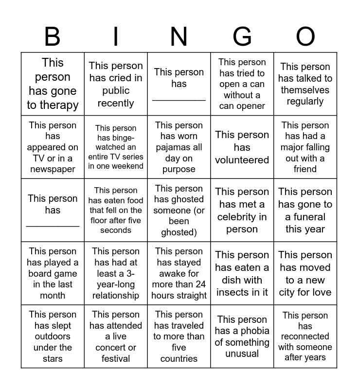 This bingo card has 46 words: This person has cried watching a movie, This person has ghosted someone (or been ghosted), This person has a tattoo, This person has traveled to more than five countries, This person has had at least a 3-year-long relationship, This person has been in a long-distance relationship, This person has cried in public recently, This person has taken part in a protest or march, This person has appeared on TV or in a newspaper, This person has a diary or journal, This person has binge-watched an entire TV series in one weekend, This person has tried to open a can without a can opener, This person has moved to a new city for love, This person has eaten a dish with insects in it, This person has taken a selfie with a wild animal, This person has broken any bones at least twice, This person has worn pajamas all day on purpose, This person has met a celebrity in person, This person has learned a new skill in the last year, This person has talked to themselves regularly, This person has eaten food that fell on the floor after five seconds, This person has a phobia of something unusual, This person has gone to therapy, This person has volunteered, This person has at least 2 siblings, This person has had a major falling out with a friend, This person has slept outdoors under the stars, This person has lost a pet they loved deeply, This person has stayed awake for more than 24 hours straight, This person has played a board game in the last month, This person has been scuba diving, This person has worn something inside out or backwards all day, This person has felt homesick recently, This person has once written a love letter, This person has lived in more than three different countries, This person has attended a live concert or festival, This person has gone to a funeral this year, This person speaks more than three languages, This person has had a job they truly hated, This person has run a marathon, This person has reconnected with someone after years, This person has __________, This person has __________, This person has __________, This person has __________ and This person has __________.
