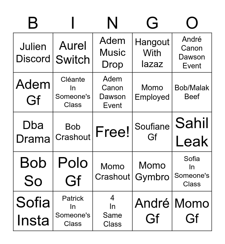This bingo card has a free space and 24 words: Polo Gf, Patrick In Someone's Class, Adem Canon Dawson Event, Sofia Insta, André Canon Dawson Event, Julien Discord, Adem Gf, Aurel Switch, Soufiane Gf, Momo Crashout, Momo Employed, Dba Drama, Momo Gymbro, Sofia In Someone's Class, Cléante In Someone's Class, André Gf, Sahil Leak, Adem Music Drop, Bob/Malak Beef, Bob Crashout, Momo Gf, Bob So, Hangout With Iazaz and 4 In Same Class.