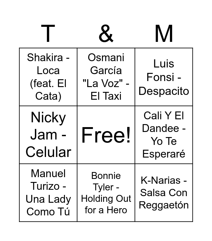This bingo card has a free space and 99 words: Karol G - Si Antes Te Hubiera Conocido, David Bisbal - Ave María, Rosalía - Despechá, Luis Fonsi - Despacito, Chayanne - Torero, David Bisbal - Bulería, Yandar & Yostin - Te Pintaron Pajaritos, Don Omar - Danza Kuduro, Chocolate - Mayonesa, Marc Anthony - Vivir Mi Vida, Joey Montana - Picky, Juan Magán - He Llorado (Como Un Niño), Chino & Nacho - Niña Bonita, Proyecto Uno - Tiburon, El Simbolo - Levantando las Manos, Shakira - Loca (feat. El Cata), Osmani García "La Voz" - El Taxi, Chanel - SloMo, Backstreet Boys - Everybody, Lou Bega - Mambo No. 5, Whigfield - Saturday Night, Pitbull - Echa Pa'lla (Manos Pa'rriba), Gloria Gaynor - I Will Survive, Sonia Y Selena - Yo Quiero Bailar, La Fiesta - La Canción Del Velero, Becky G - Mayores, Bonnie Tyler - Holding Out for a Hero, Britney Spears - ...Baby One More Time, Jaxomy - Pedro, Daddy Yankee - La Despedida, Juan Magán - Verano Azul, The Soca Boys - Follow The Leader, Backstreet Boys - I Want It That Way, Boney M. - Daddy Cool, Celine Dion - I'm Alive, Whitney Houston - I Will Always Love You, King Africa - La Bomba, María Isabel - Antes Muerta Que Sencilla, Juanes - La Camisa Negra, O-Zone - Dragostea din tei, Vicco - Nochentera, Sebastian Yatra - Vagabundo, Nicky Jam - Celular, Beret - SUPERHÉROES, Disturbed - The Sound of Silence - CYRIL Remix, Mark Ambor - Belong Together, Myles Smith - Nice To Meet You, Alex Warren - Ordinary, Meghan Trainor - Made You Look, Celia Cruz - La Vida Es Un Carnaval, Nicky Jam - El Perdón (with Enrique Iglesias), CNCO - Reggaetón Lento (Bailemos), Avicii - Wake Me Up, Chayanne - Madre Tierra (Oye), David Guetta - Forever Young, Beyoncé - Single Ladies (Put a Ring on It), Justin Bieber - Sorry, Funzo & Baby Loud - Inmortales, Gente De Zona - La Gozadera (feat. Marc Anthony), Daddy Yankee - Limbo, Village People - YMCA, Los Del Río - Macarena, ABBA - Dancing Queen, Las Ketchup - Aserejé, ABBA - Mamma Mia, K-Narias - Salsa Con Reggaetón, Queen - We Will Rock You, Queen - We Are The Champions, Pereza - Princesas, Juan Magán - Bailando por Ahi, Black Eyed Peas - I Gotta Feeling, AronChupa - I'm an Albatraoz, Cali Y El Dandee - Yo Te Esperaré, Cali Y El Dandee - Por Fin Te Encontré, Chayanne - Humanos a Marte, Silver Pozzoli - Around My Dream, Manuel Turizo - Una Lady Como Tú, Juan Magán - Vuelve, Fuego - Una Vaina Loca, Roxette - Sleeping In My Car, Rocco Hunt - A Un Passo Dalla Luna, Flo Rida - Right Round, Iyaz - Replay, R. City - Make Up (feat. Chloe Angelides), Daddy Yankee - ¿Qué Tengo Que Hacer?, Zucchero - Baila Morena, Amaral - Moriría por vos, DJ Matrix - Sarà perché ti amo, Gabry Ponte - Exotica, RedOne - Don't You Need Somebody (feat. Enrique Iglesias, R. City, Serayah & Shaggy), Mohombi - Coconut Tree, Bennett - Vois sur ton chemin - Techno Mix, PSY - Gangnam Style, Michel Teló - Ai Se Eu Te Pego, Eiffel 65 - Blue (Da Ba Dee) - Gabry Ponte Ice Pop Radio, Taio Cruz - Dynamite, Nino Bravo - Un Beso Y Una Flor, Miguel Bosé - Amante Bandido and Morat - Besos En Guerra.