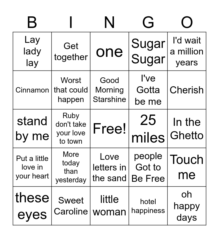 This bingo card has a free space and 43 words: Love or let me be lonely, oh happy days, this magic moment, these eyes, its your thing, hotel happiness, one, only you, I'd wait a million years, Sweet Caroline, Sugar Sugar, 25 miles, Love letters in the sand, More today than yesterday, Hey Paula, little woman, son of a preacher man, stand by me, the Boxer, Cherish, Get together, Polk salad Annie, Cloud 9, Lay lady lay, And When I Die, In the Ghetto, Baby I'm For Real, It's your thing, people Got to Be Free, Put a little love in your heart, A boy Named sue, Touch me, Tracy, Ruby don't take your love to town, Grazing in the grass, tighten up, precious & few, Good Morning Starshine, Cinnamon, I've Gotta be me, Games people play, Worst that could happen and Indian Giver.