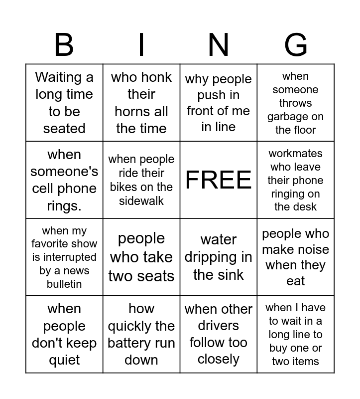 This bingo card has 16 words: how quickly the battery run down, people who make noise when they eat, why people push in front of me in line, Waiting a long time to be seated, when my favorite show is interrupted by a news bulletin, who honk their horns all the time, water dripping in the sink, when other drivers follow too closely, when someone's cell phone rings., when people ride their bikes on the sidewalk, when people don't keep quiet, when someone throws garbage on the floor, people who take two seats, workmates who leave their phone ringing on the desk, FREE and when I have to wait in a long line to buy one or two items.