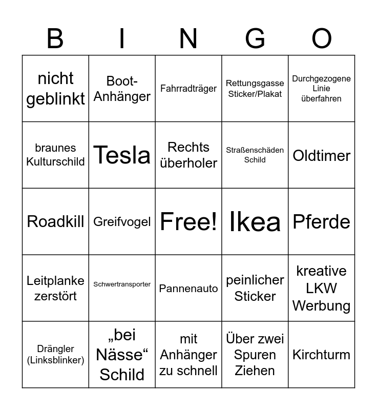 This bingo card has a free space and 24 words: Schwertransporter, „bei Nässe“ Schild, Rechts überholer, Drängler (Linksblinker), Durchgezogene Linie überfahren, nicht geblinkt, braunes Kulturschild, Boot- Anhänger, Ikea, Pannenauto, Straßenschäden Schild, Roadkill, peinlicher Sticker, kreative LKW Werbung, Tesla, Über zwei Spuren Ziehen, Pferde, Fahrradträger, Oldtimer, Greifvogel, Kirchturm, Leitplanke zerstört, Rettungsgasse Sticker/Plakat and mit Anhänger zu schnell.