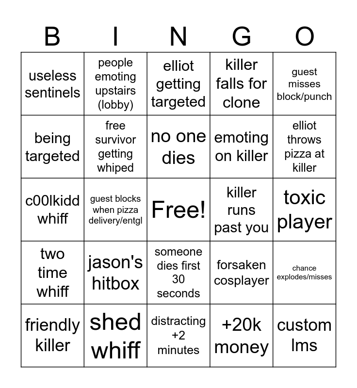 This bingo card has a free space and 24 words: jason's hitbox, shed whiff, no one dies, friendly killer, guest misses block/punch, useless sentinels, being targeted, people emoting upstairs (lobby), killer runs past you, someone dies first 30 seconds, emoting on killer, c00lkidd whiff, forsaken cosplayer, chance explodes/misses, free survivor getting whiped, +20k money, toxic player, elliot getting targeted, elliot throws pizza at killer, guest blocks when pizza delivery/entgl, custom lms, two time whiff, killer falls for clone and distracting +2 minutes.