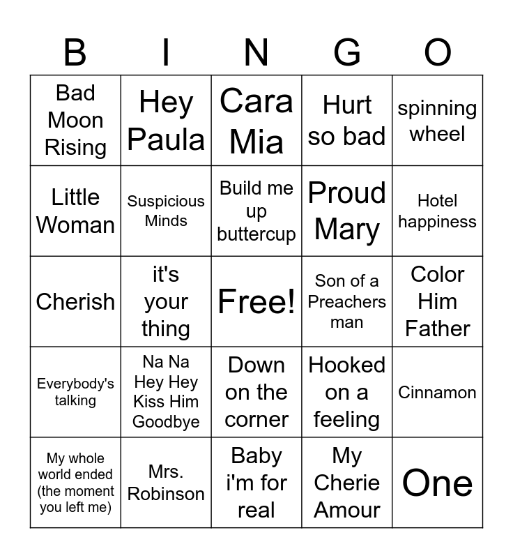 This bingo card has a free space and 28 words: Cinnamon, In the Ghetto, Proud Mary, My Cherie Amour, Little Woman, Cara Mia, Hey Paula, Everybody's talking, Son of a Preachers man, My whole world ended (the moment you left me), Cherish, Hurt so bad, Mrs. Robinson, Baby i'm for real, Hotel happiness, lay lady lay, Na Na Hey Hey Kiss Him Goodbye, Suspicious Minds, Build me up buttercup, Down on the corner, Bad Moon Rising, Oh happy Day, One, it's your thing, Color Him Father, Hooked on a feeling, spinning wheel and that's the way love is.