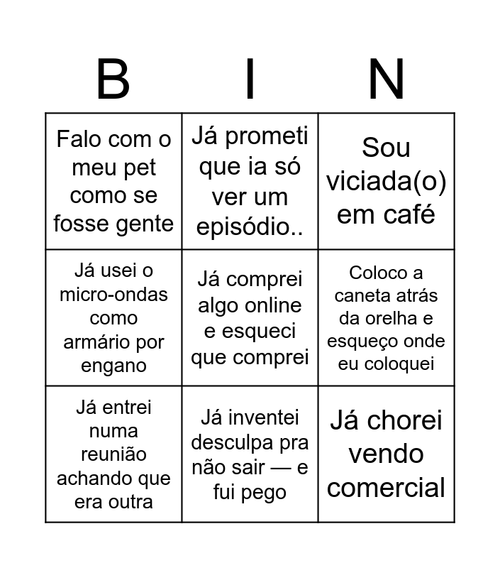 This bingo card has 18 words: Já trabalhei de pijama, Tenho planta em casa, Sou viciada(o) em café, Falo com o meu pet como se fosse gente, Free!, Já usei o micro-ondas como armário por engano, Já comecei a dieta na segunda e terminei na terça, Já prometi que ia só ver um episódio.., Já inventei desculpa pra não sair — e fui pego, Já chorei vendo comercial, Já fui comprar pão e voltei com chocolate, Já comprei algo online e esqueci que comprei, Já fui no mercado e esqueci o principal item, Coloco a caneta atrás da orelha e esqueço onde eu coloquei, Já entrei numa reunião achando que era outra, Já fiz pedido por delivery mesmo com comida em casa, Já deixei e-mail no rascunho e achei que tinha enviado and Já deitei pra descansar e acordei no outro dia.