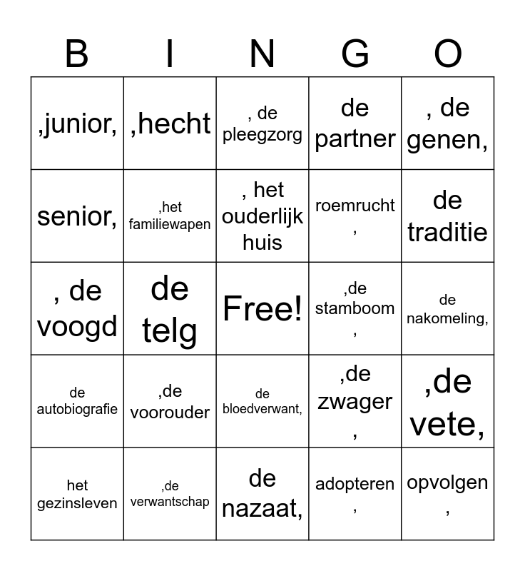 This bingo card has a free space and 34 words: aangetrouwd ,, adopteren ,, afstammen ,, de anekdote,, de autobiografie, ,het familiewapen, , de genen,, het gezinsleven, ,hecht, ,de kennisgeving, , het ouderlijk huis, , de pleegzorg, ,de roepnaam,, de schoonzus, ,de stamboom ,, de traditie, ,de verwantschap, , de voogd, ,de voorouder, ,de zwager ,, de bloedverwant,, de historie, ,junior,, de nakomeling,, de nazaat,, opvolgen ,, de partner, ,het probleemgezin ,, roemrucht ,, senior,, de stamvader,, de telg, ,de vete, and zorgzaam.
