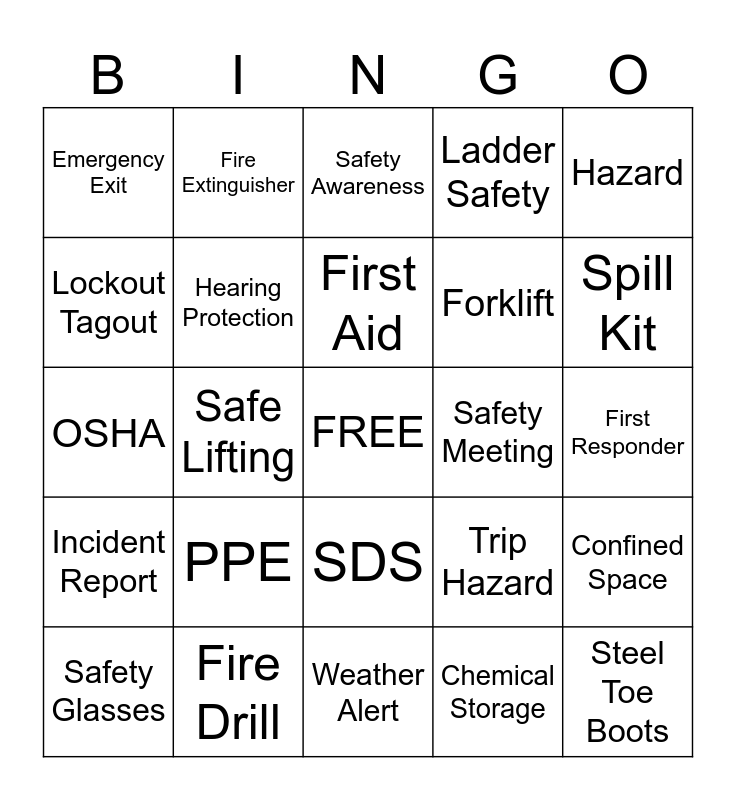 This bingo card has a free space and 24 words: PPE, Fire Drill, First Aid, Safety Glasses, Hazard, Emergency Exit, Lockout Tagout, Fire Extinguisher, Safety Meeting, SDS, Forklift, OSHA, Trip Hazard, Confined Space, Hearing Protection, Chemical Storage, First Responder, Safety Awareness, Spill Kit, Safe Lifting, Steel Toe Boots, Incident Report, Ladder Safety and Weather Alert.