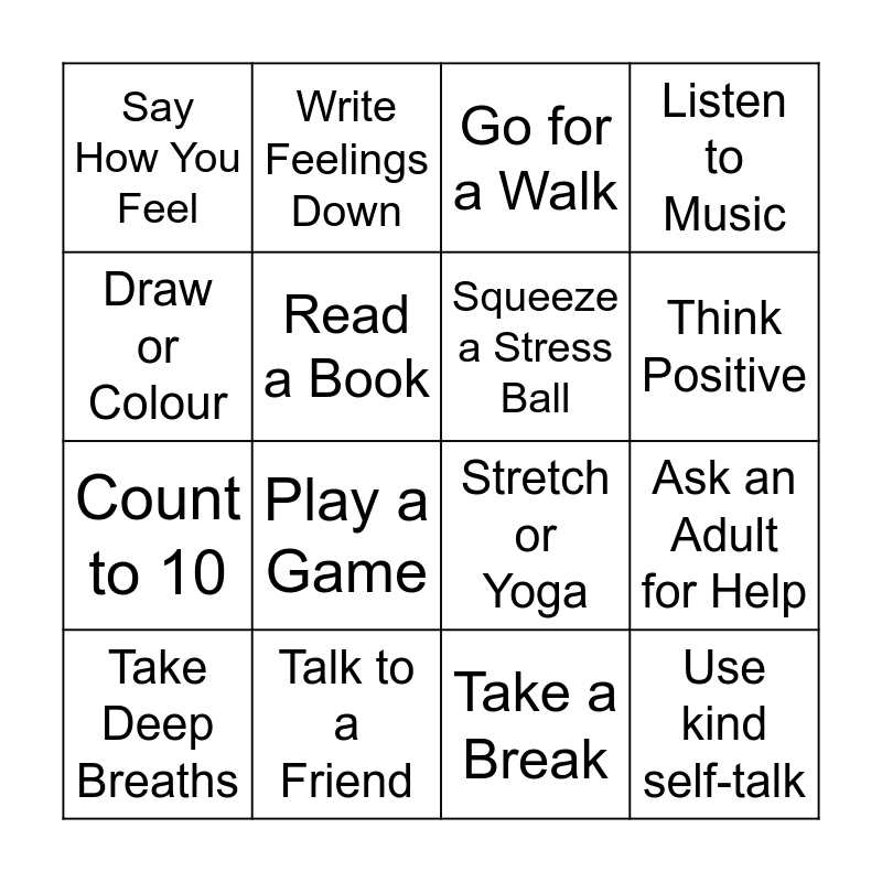 This bingo card has 16 words: Take Deep Breaths, Talk to a Friend, Go for a Walk, Listen to Music, Draw or Colour, Write Feelings Down, Stretch or Yoga, Ask an Adult for Help, Say How You Feel, Read a Book, Take a Break, Think Positive, Count to 10, Play a Game, Squeeze a Stress Ball and Use kind self-talk.