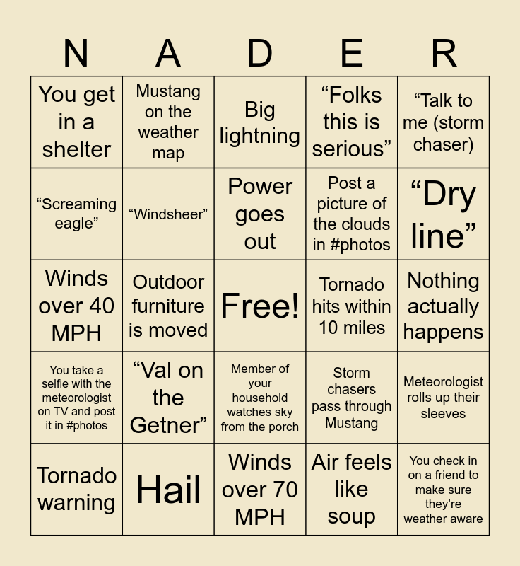 This bingo card has a free space and 24 words: “Val on the Getner”, Hail, Power goes out, Tornado warning, “Talk to me (storm chaser), You get in a shelter, “Screaming eagle”, Mustang on the weather map, Tornado hits within 10 miles, Member of your household watches sky from the porch, Post a picture of the clouds in #photos, Winds over 40 MPH, Storm chasers pass through Mustang, Meteorologist rolls up their sleeves, “Windsheer”, Air feels like soup, Nothing actually happens, Big lightning, “Dry line”, Outdoor furniture is moved, You check in on a friend to make sure they’re weather aware, You take a selfie with the meteorologist on TV and post it in #photos, “Folks this is serious” and Winds over 70 MPH.
