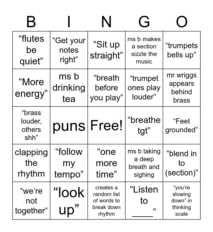 This bingo card has a free space and 24 words: “follow my tempo”, “look up”, “breath before you play”, “we’re not together”, “trumpets bells up”, “flutes be quiet”, “More energy”, “Get your notes right”, “breathe tgt”, “one more time”, “trumpet ones play louder”, “brass louder, others shh”, ms b taking a deep breath and sighing, “blend in to (section)”, ms b drinking tea, “Listen to ____”, “Feet grounded”, “Sit up straight”, mr wriggs appears behind brass, puns, “you’re slowing down” in thinking scale, clapping the rhythm, ms b makes a section sizzle the music and creates a random list of words to break down rhythm.